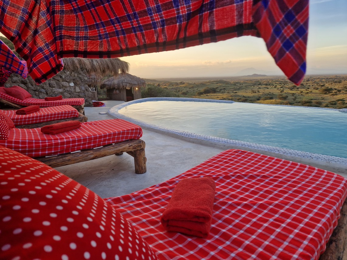 Neben den komfortablen Unterkünften bietet die Original Maasai Lodge eine Reihe an erstklassigen Annehmlichkeiten. Entspannen Sie sich im Infinity-Pool mit atemberaubendem Blick auf die endlose Steppe, genießen Sie ein erfrischendes Getränk an der Poolbar oder lassen Sie sich in der Sauna verwöhnen. Für zusätzliche Entspannung stehen Ihnen Massageangebote und ein Ruhebereich zur Verfügung.